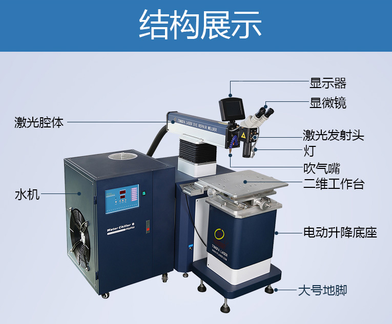 出口型模具激光焊機是通發(fā)激光公司專門為出口國外客戶使用而設計的系列機型TFL-200E,適用于各類精密注塑模具、壓鑄模具等模具激光修補焊接;同時也適合鑄件沙孔激光修補、模具崩缺激光修復、過切加工等的激光修補;各類金屬結(jié)構(gòu)件、金銀首飾的激光焊接加工。