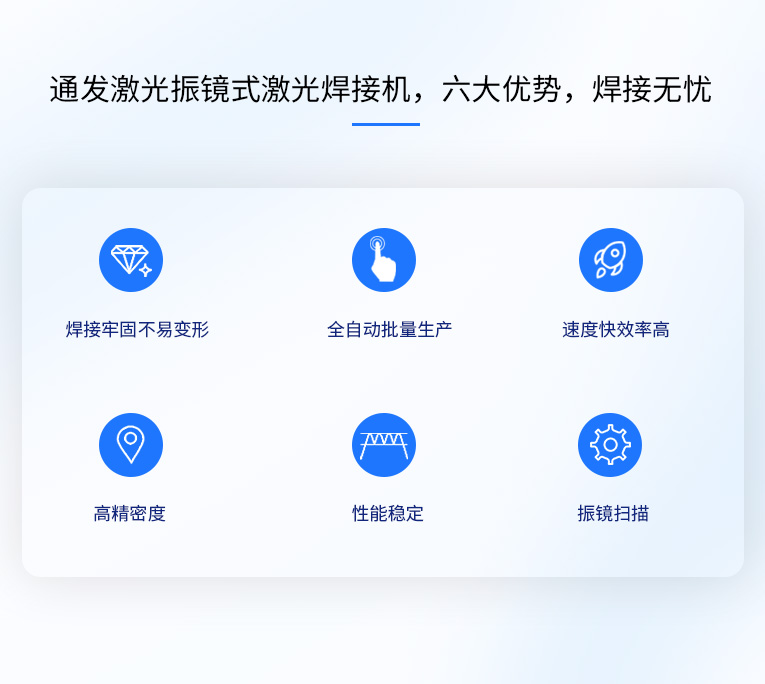 1、采用高速掃描振鏡進(jìn)行激光定位,速度可達(dá)7000mm/s,極大的降低了焊接位置之間的空走時(shí)間,從而大大的提高生產(chǎn)效率;