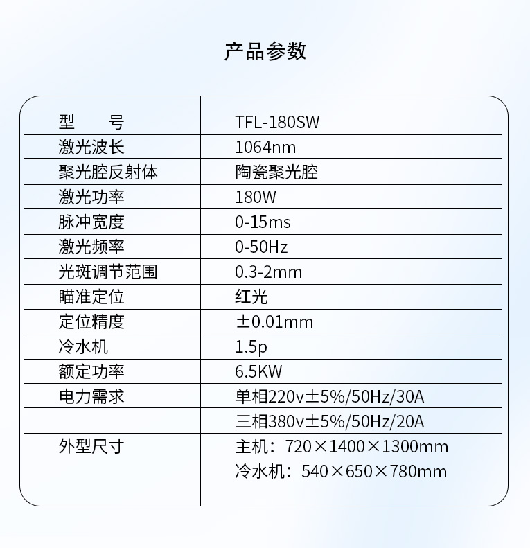 主機(jī):720×1400×1300mm 冷水機(jī):540×650×780mm |