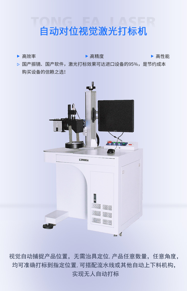 通發(fā)激光研發(fā)的自動(dòng)對(duì)位視覺激光打標(biāo)機(jī)TFL-F20CY-ZD,視覺自動(dòng)捕捉產(chǎn)品位置,無需治具定位,產(chǎn)品任意數(shù)量,任意角度,均可準(zhǔn)確打標(biāo)到指定位置,可搭配流水線或其他自動(dòng)上下料機(jī)構(gòu),節(jié)省人力,實(shí)現(xiàn)無人自動(dòng)打標(biāo),可搭配流水線或其他自動(dòng)上下料機(jī)構(gòu),節(jié)省人力,實(shí)現(xiàn)無人自動(dòng)打標(biāo),極高的重復(fù)頻率,打標(biāo)速度快;極高的光學(xué)質(zhì)量,實(shí)現(xiàn)精細(xì)打標(biāo),可與光纖、CO2、半導(dǎo)體等各種波長的激光光路集成.