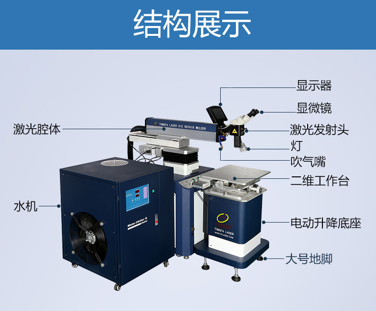 出口型模具激光焊機是通發激光公司專門為出口國外客戶使用而設計的系列機型TFL-200E-D,配置激光頭電動升降,同時配置操縱桿無極調速控制XY橫向和縱向電動移動。適用于各類精密注塑模具、壓鑄模具等模具激光修補焊接;同時也適合鑄件沙孔激光修補、模具崩缺激光修復、過切加工等的激光修補;各類金屬結構件、金銀首飾的激光焊接加工。