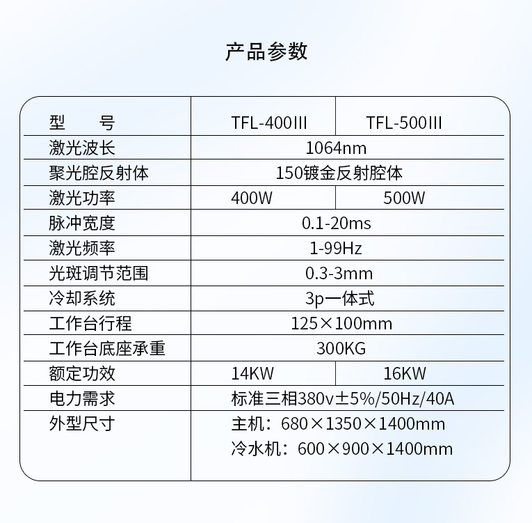 TFL-400Ⅲ型模具激光焊機是通發(fā)激光公司自主研發(fā)的一款大功率激光焊接機,采用通發(fā)自主研發(fā)的二代精密雙燈電源為燈泵浦驅(qū)動電源,配置觸摸屏,操作更方便。主機具備激光頭手搖升降與工作臺按鈕電動升降實現(xiàn)焊接不同厚度模具的激光焊加工。本款機型更適用于各類大功率、大面積激光修補的模具。由于激光功率大,同時可激光焊接鈹銅模具,鋁材模具或鋁材零件。在大面積激光修補模具時,可以使用更粗的焊絲,激光焊接效率大幅提升。