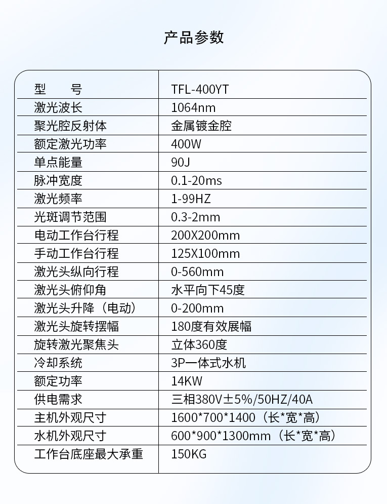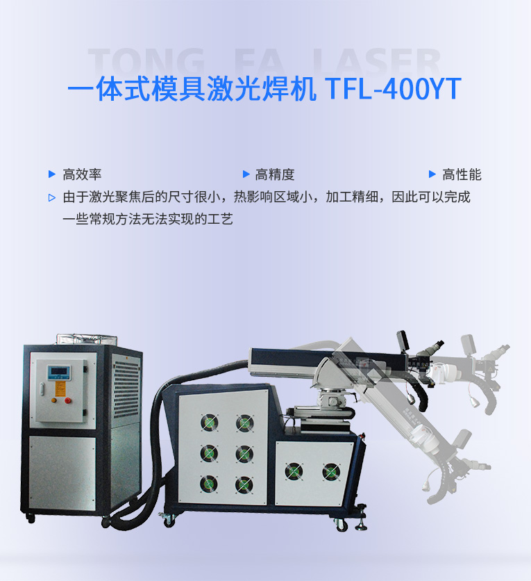 通發(fā)激光一體式模具激光焊機(jī)TFL-400YT是一款多種功能融合一體的新型模具激光焊接機(jī),針對特大型塑料模具激光焊、中型注塑模具激光燒焊、小型塑膠模具激光補(bǔ)焊、壓鑄模激光補(bǔ)焊具等各類模具可實(shí)現(xiàn)超精密修復(fù),幫您解決大型汽車模具修復(fù)難題,不需要模具移動,電動工作臺與立體旋轉(zhuǎn)激光頭完美結(jié)合,操作桿控制運(yùn)動移動實(shí)現(xiàn)輕松激光修復(fù)大型模具,同時(shí)也保留了傳統(tǒng)手動工作臺超精密修復(fù)模具功能。